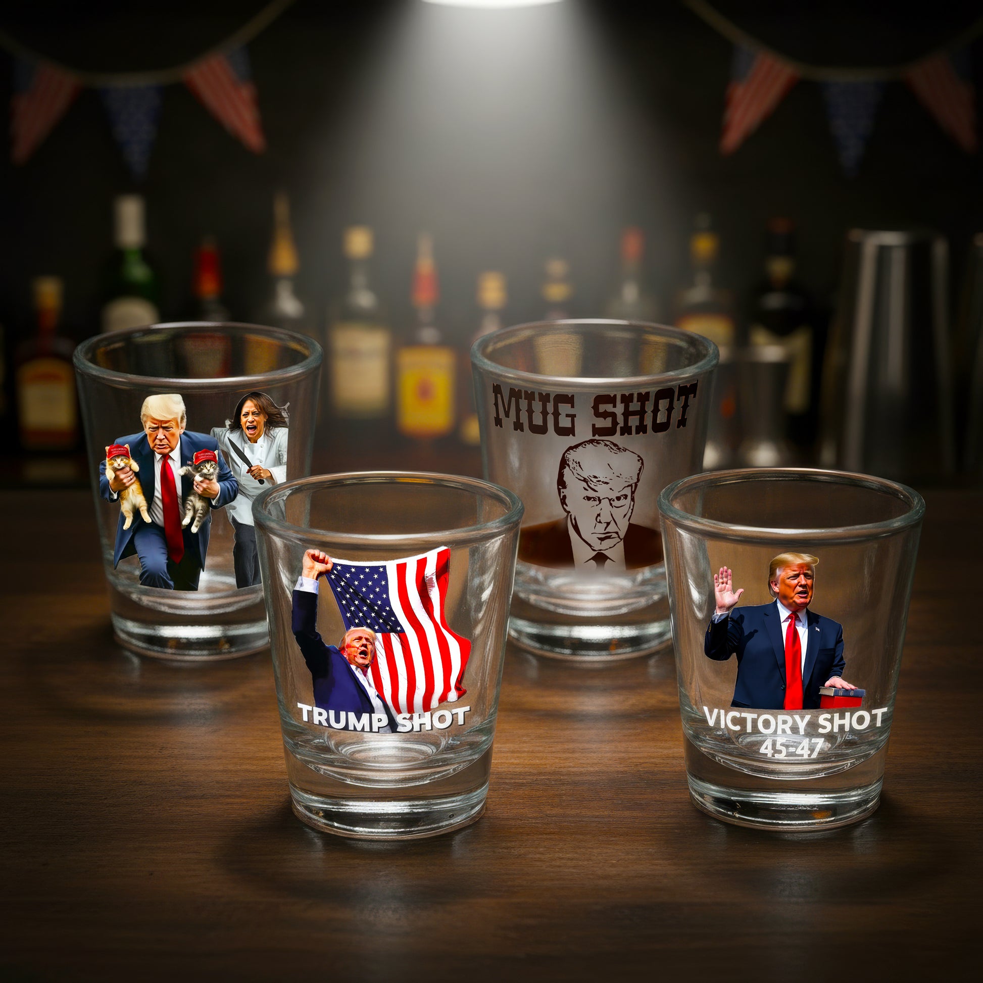 - Trump Shot – Trump proudly holding the American flag, the perfect toast to freedom and victory.